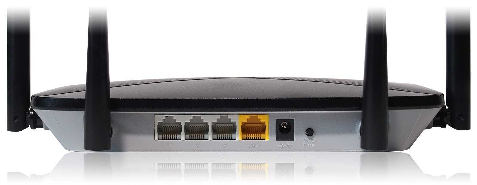 Разъемы проводных интерфейсов, питания и кнопка WPS/Reset размещены на задней части устройства. Их названия отлиты на пластиковом корпусе и тяжело различимы. Чтобы не запутаться, WAN-порт для подключения ethernet-кабеля от провайдера выделен желтым цветом.