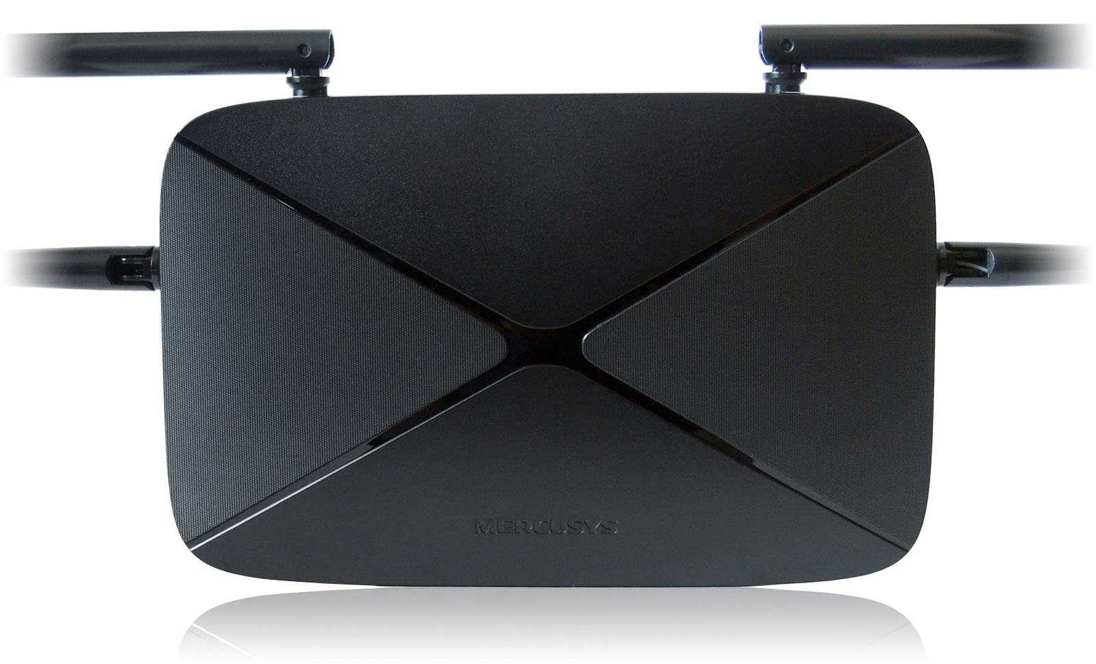 Верхняя крышка чёрная, стилизованная орнаментом с X-образным перекрестием и логотипом Mercusys.