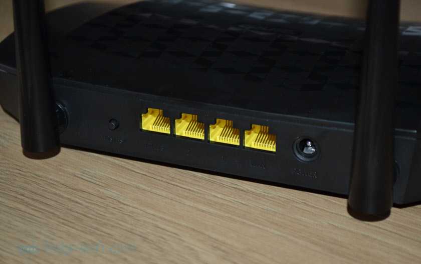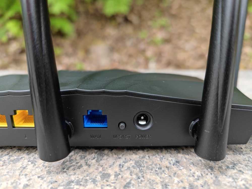 Сзади — ещё две антенны, совмещенная кнопка WPS и сброса настроек, разъем питания и четыре порта подключения: разъем WAN и три LAN-порта. Они все желтого цвета, так что при подключении надо ориентироваться по надписям. Отдельной кнопки питания — нет.