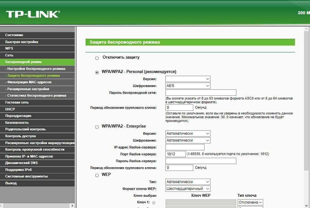 - далее перейдите во вкладку «Беспроводной режим→Защита беспроводного режима»;