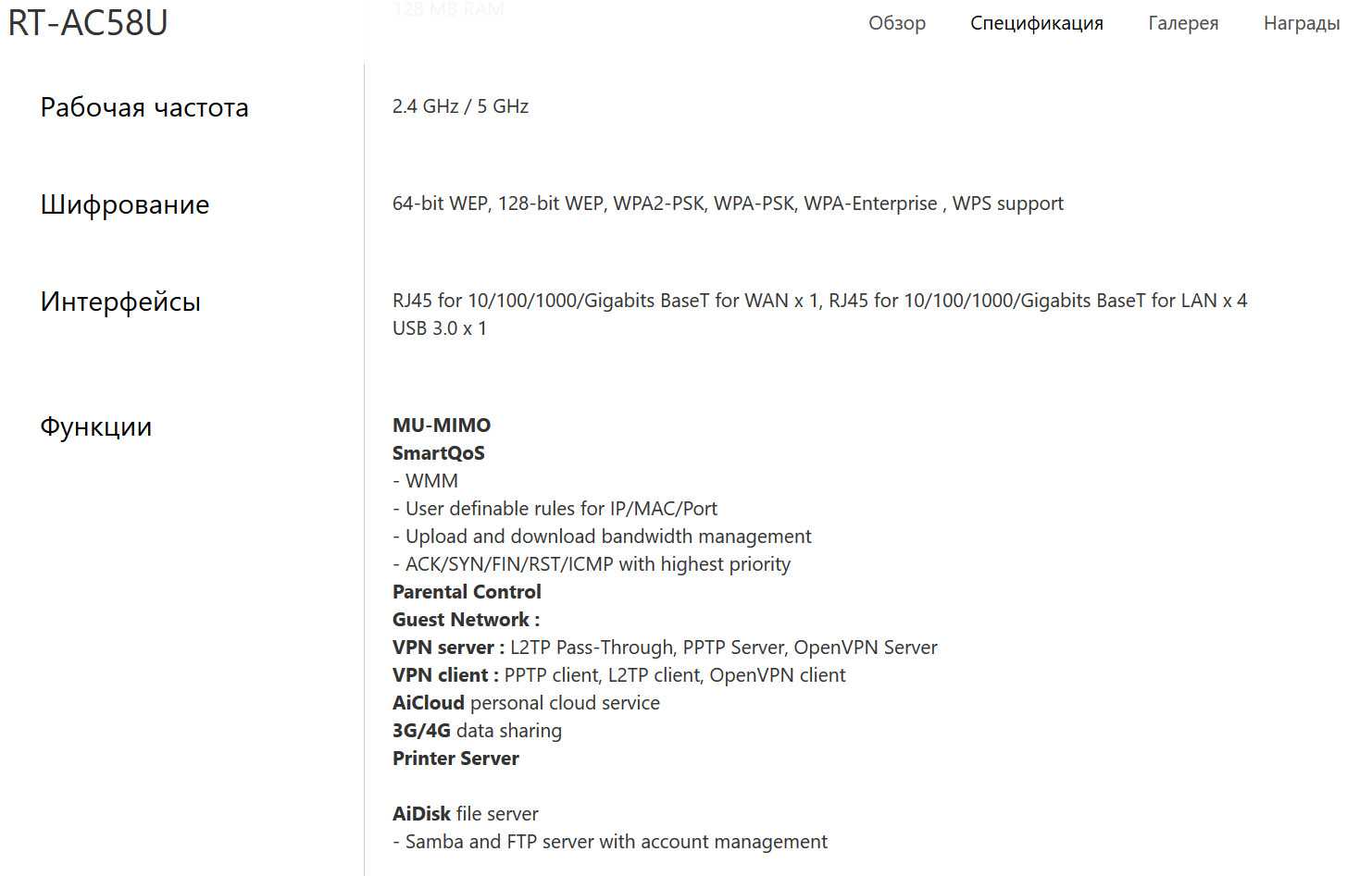 | Прочее | Режимы: маршрутизатор / точка доступа |