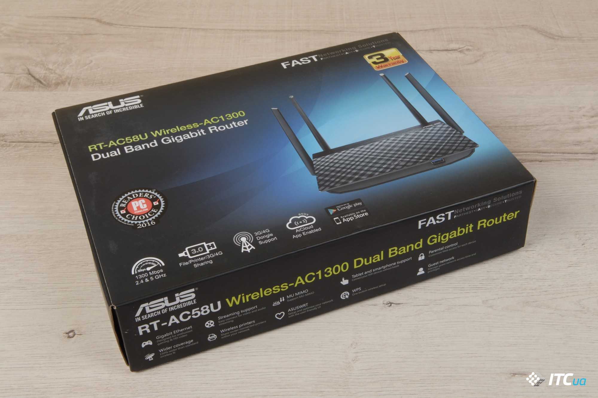 ASUS RT-AC58U — это беспроводной маршрутизатор класса AC1300. Устройство оснащается гигабитными сетевыми портами и создает две сети Wi-Fi со скоростью подключения до 300 Мбит/с (2,4 ГГц) и 867 Мбит/с (5 ГГц). Обычно такие маршрутизаторы относятся к классу AC1200, что подразумевает суммарную теоретическую пропускную способность Wi-Fi до 1,2 Гб/с.