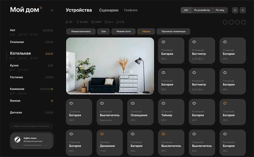Кроме этого на карточке каждой комнаты увидите статусную строку с показателями разных приборов и датчиков. Разработчики постарались найти идеальный баланс между количеством информации, интерактивными элементами и пустым пространством на экране, чтобы интерфейс не напрягал и был удобным.