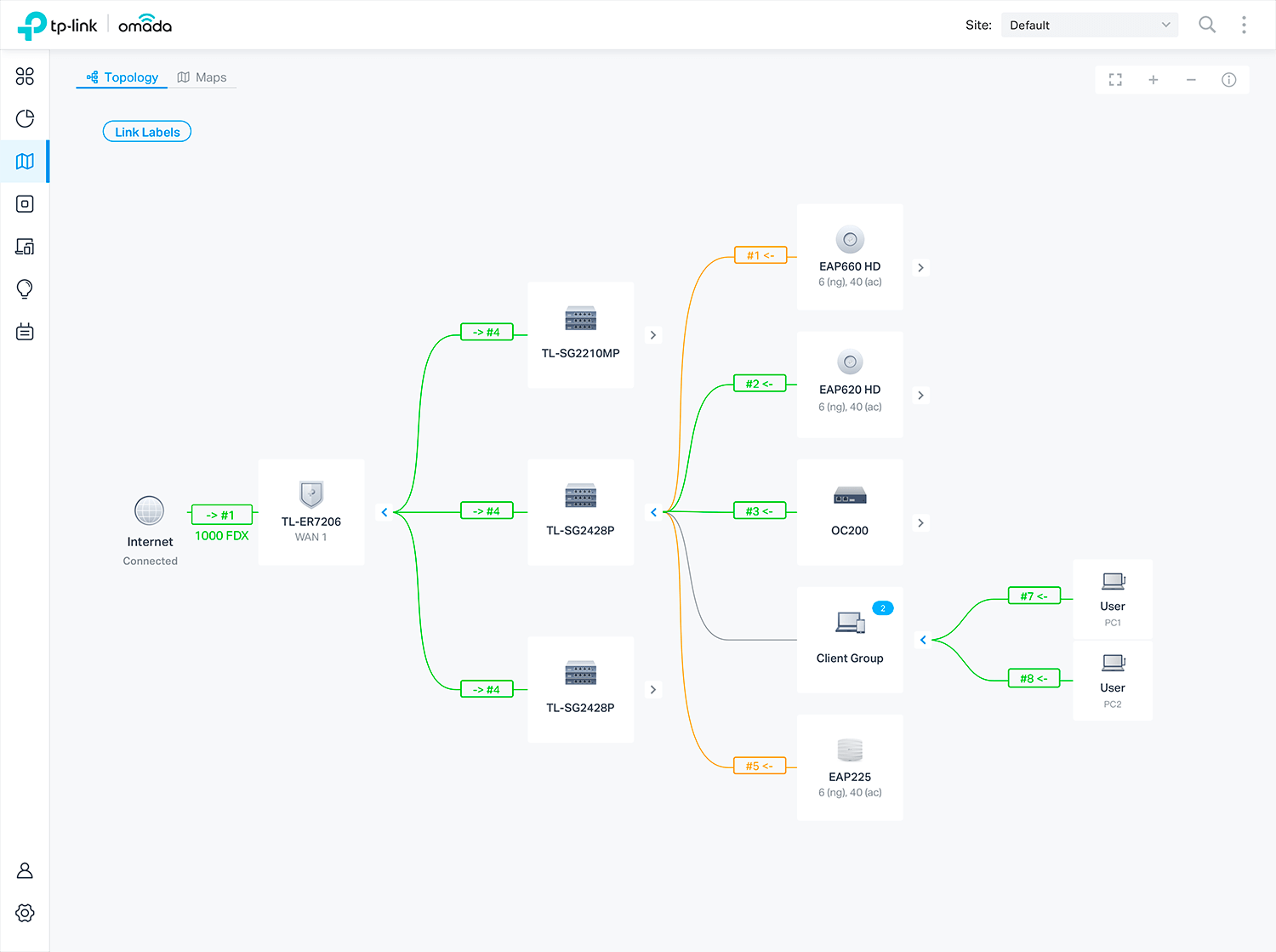 Комплекс объектов сети настраивается централизованно через «облако» посредством интерфейса управления (контроллера). Автоматическое определение параметров оборудования облачным контроллером Omada SDN: