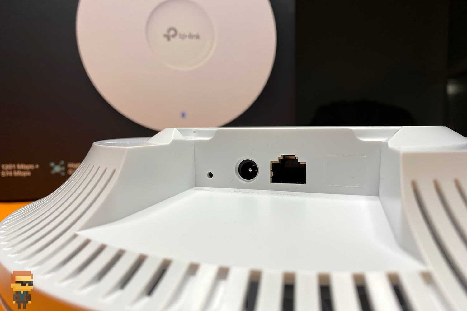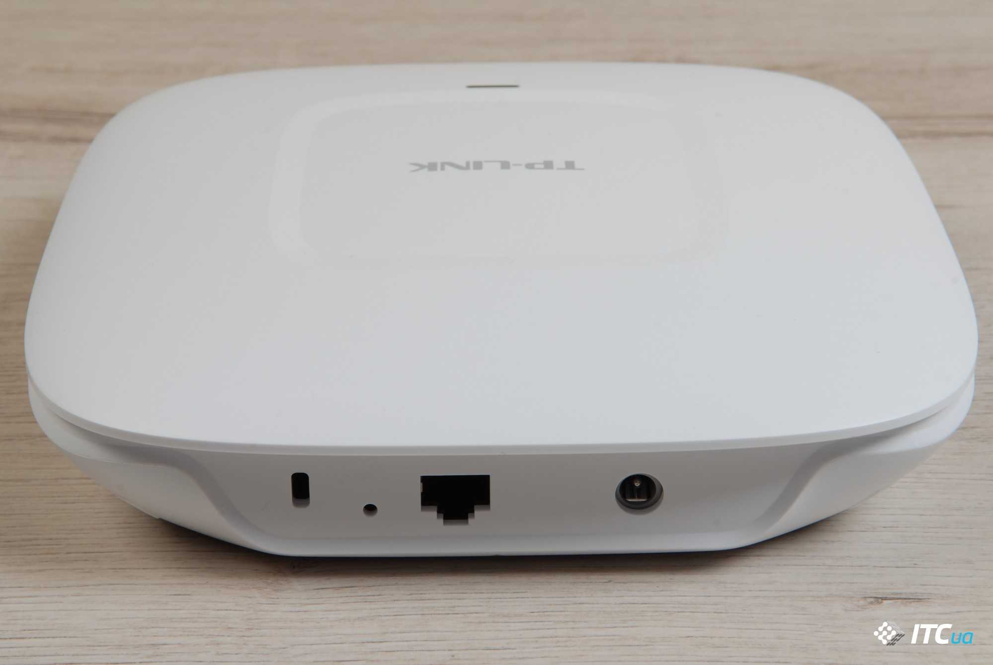 Как и большинство точек доступа, EAP115 выглядит максимально аккуратно и неприметно. Корпус сделан из белого пластика, на лицевой панели есть статусный индикатор. Сзади — разъем Ethernet, коннектор блока питания, утопленная клавиша перезагрузки, а также отверстие для замка Kensington.