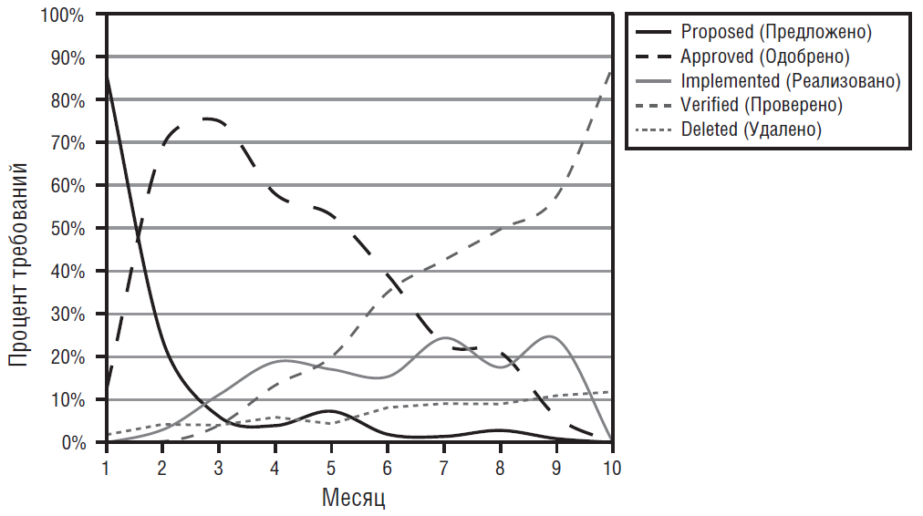 На рисунке «Отслеживание распределения состояний требований в цикле разработки проекта» показано, как контролировать состояние требования в гипотетическом 10-месячном проекте: на графике показано, сколько процентов требований к системе в каждом состоянии имеется в конце каждого месяца.
