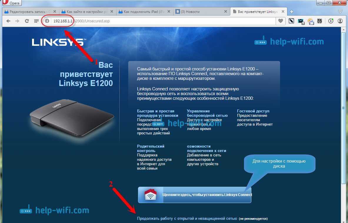Вход в настройки на Linksys по адресу 192.168.1.1